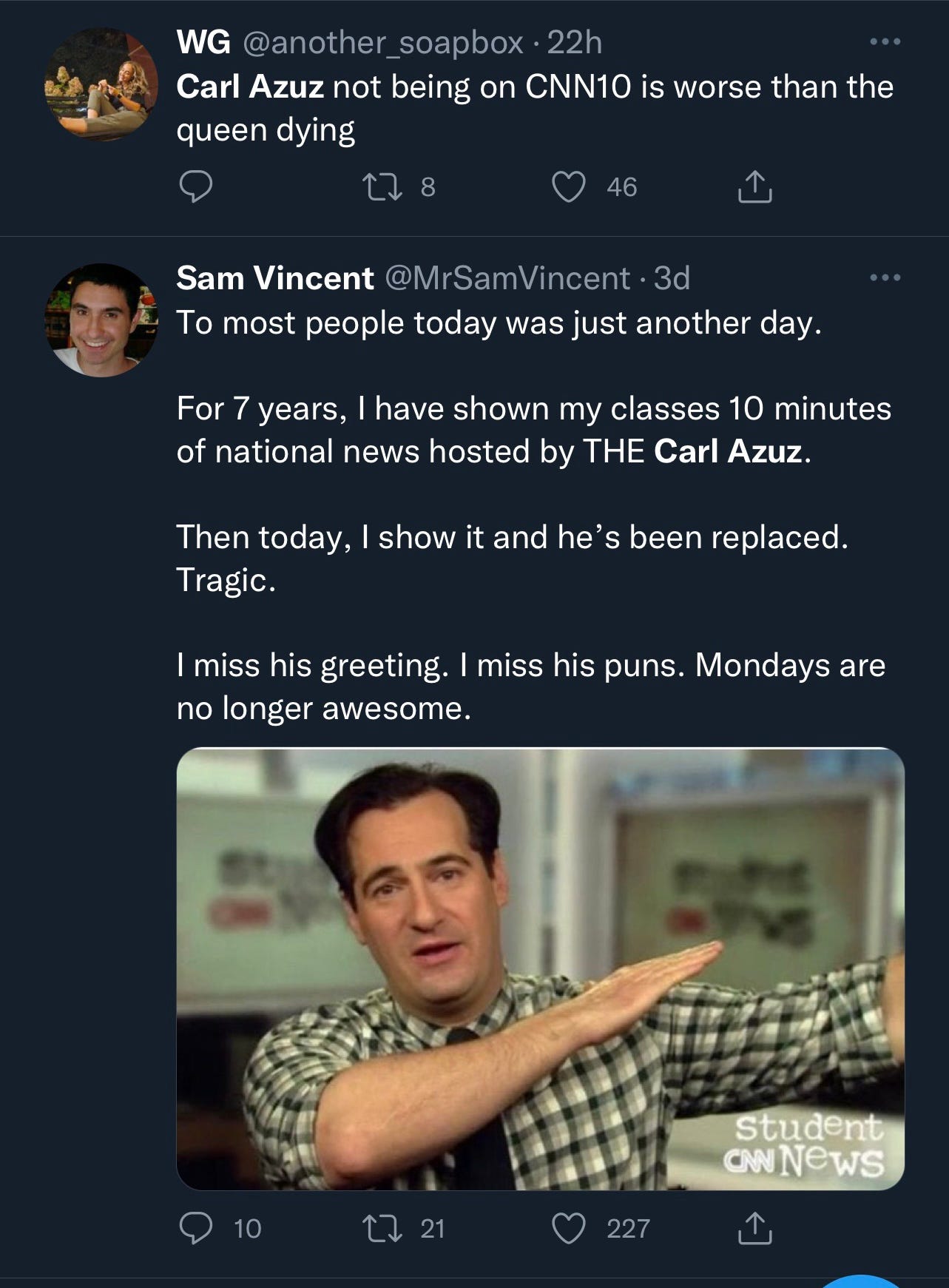 Even in high school I still watched CNN 10. In a statement that was printed in the shows newsletter on September 18. Carl was always an inspiration to me he said.